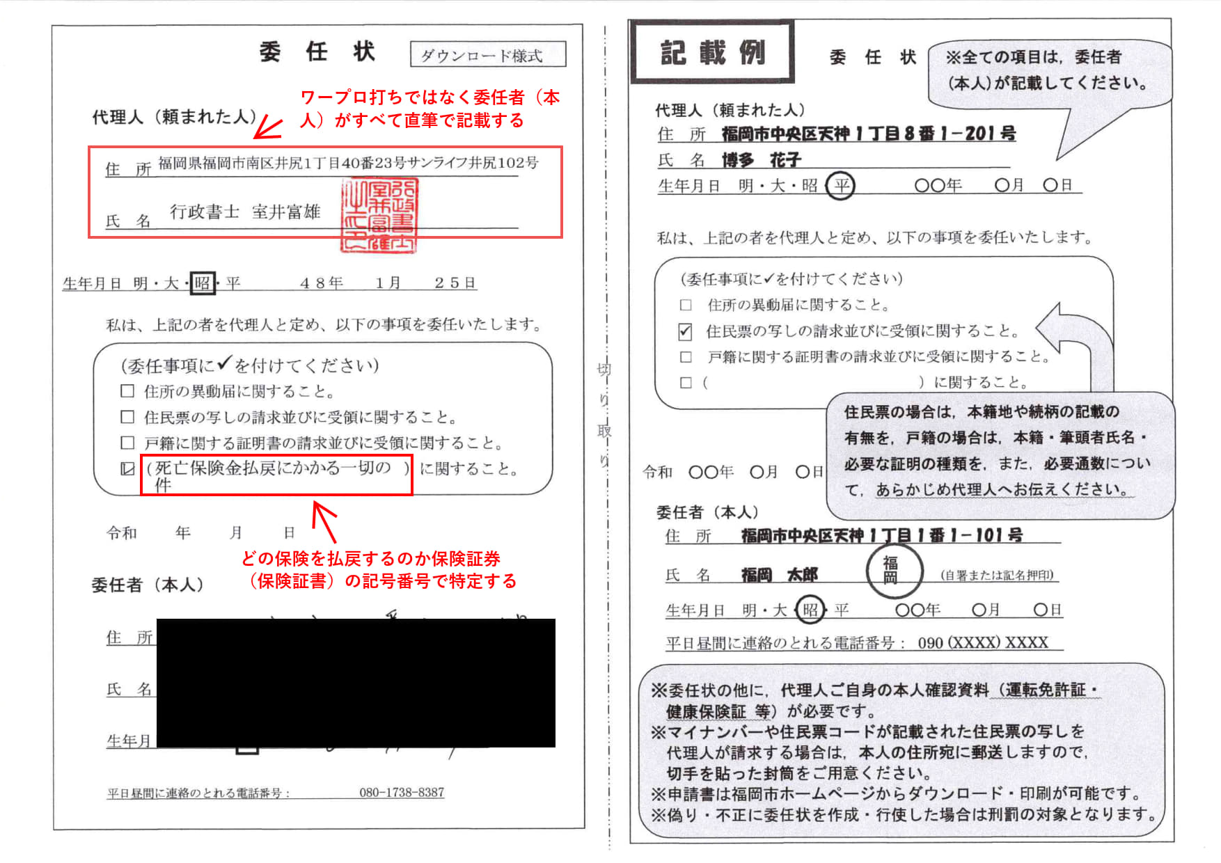 福岡市の委任状(住民票や戸籍の届出・証明請求用)で死亡保険金の払戻をやってみた件