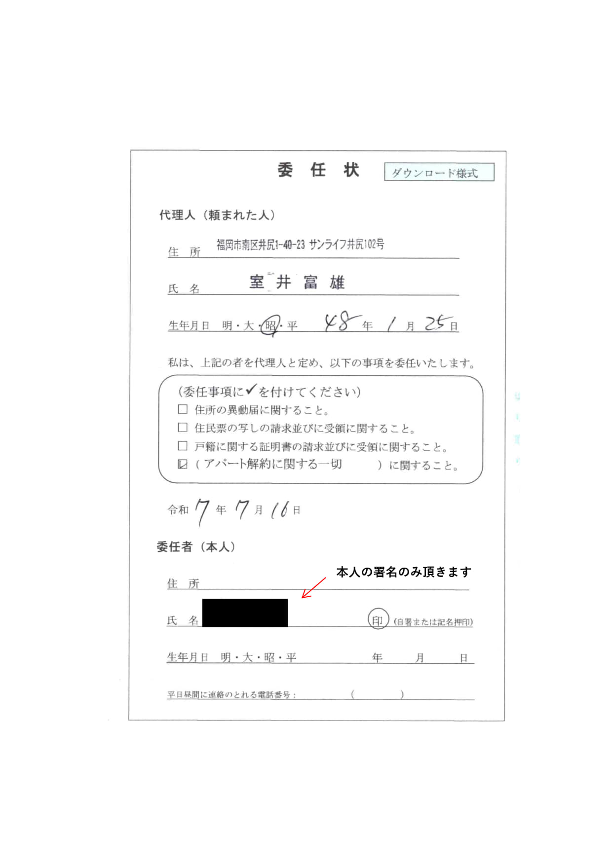実際のアパート解約に関する委任状