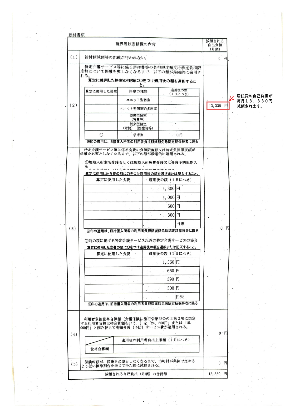 境界層該当措置を受けるために同書類を介護保険課に提出し、介護保険負担限度額認定を申請します。境界層該当措置とは、本来適用される基準を適用すれば生活保護を必要とするが、より低い基準を適用すれば生活保護を必要としない状態であると福祉事務所長に認められた場合、同基準を適用します。